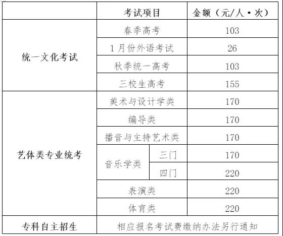 根據《關于上海市教育考試院有關考試收費等問題的復函》(滬價費〔2006〕005號、滬財預聯〔2006〕1號);《關于調整上海市教育考試院外語口語考試等收費標準的復函》(滬價費〔2003〕069號、滬財預〔2003〕第104號)文件規定,文化考試收費標準:報名費為每項考試25元/人(專科自主招生報名考試費另行通知),考試費為每項考試每科目26元/人;藝術類考試收費:報名費為每項考試20元/人,考試費為每項考試每科目50元/人。各類考試項目須繳納費用如下表所示: